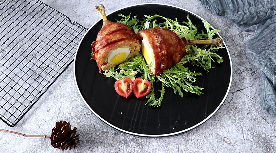 将培根一张叠一张的摊开铺好,中间部位先放入一点鸡肉馅儿,将腌制好的鸡腿放在肉馅儿上面(鸡骨朝外放,两个鸡腿的肉贴在一起放)。